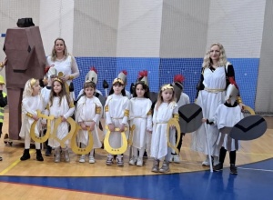 Karneval se održao u dvorani „Vinko Kandija“ te se svaki vrtić predstavio sa svojim kostimima i točkom. Skupina „Medonjice“ su ove godine bili grčki ratnici i grčke božice obzirom da smo u projektu „Mali vremeplov – Trogir kroz povijest“, a iza Ilira na ovim našim prostorima živjeli su upravo Grci.