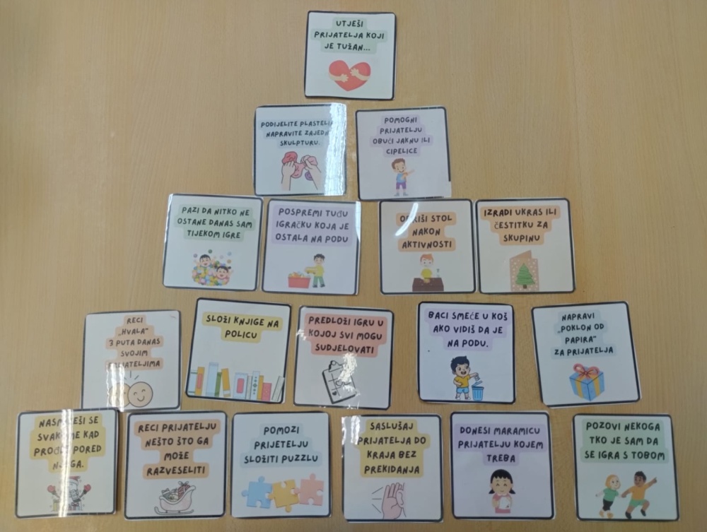"Lanac dobrih djela", "Naš adventski zagrljaj", "Gradimo božićno stablo prijateljstva", "Čestitka za prijatelja", "Blagdanske ruke prijateljstva", "Zajednički krug pohvala", "Božićni ples u paru" samo su neke od njih.